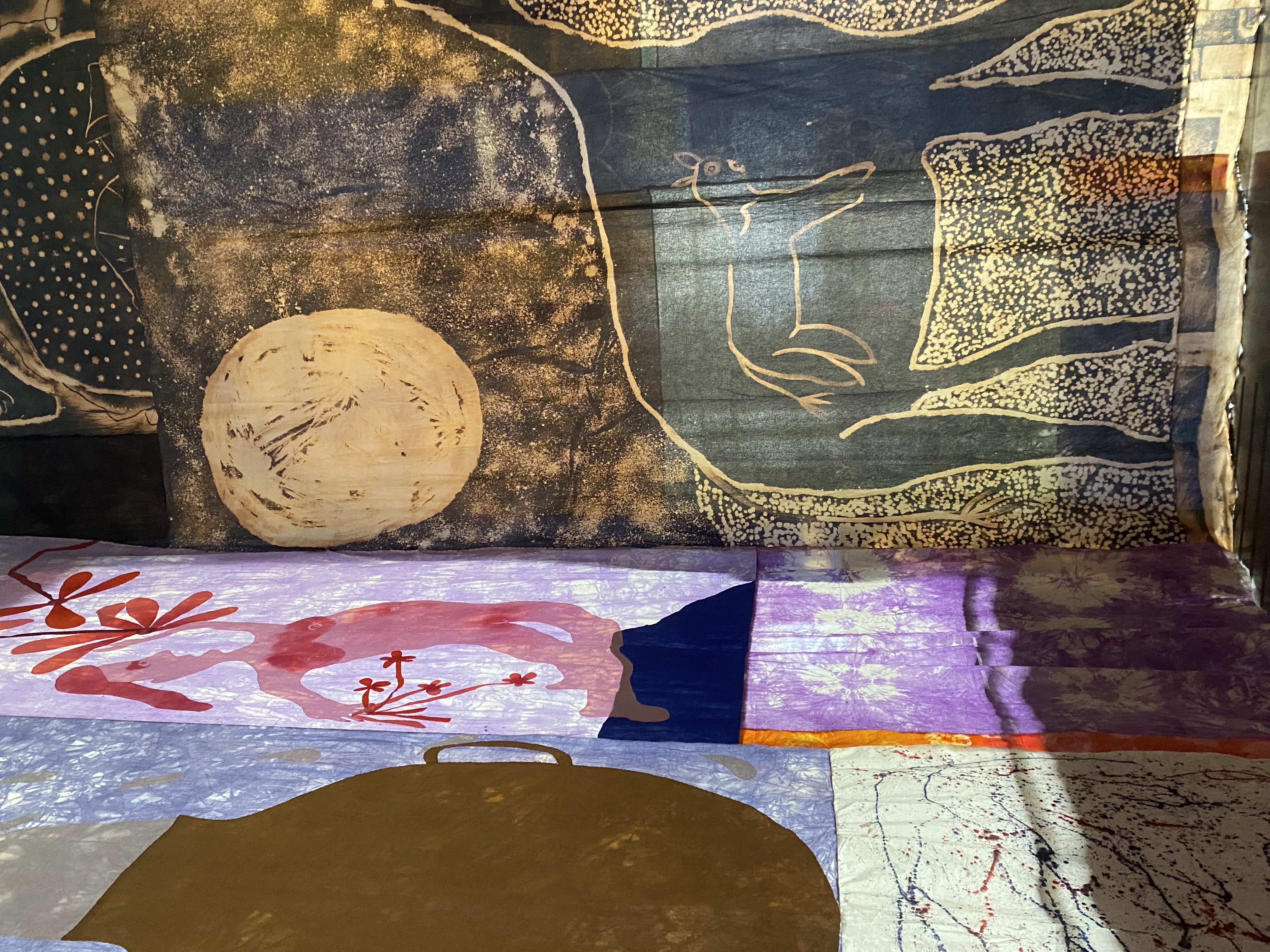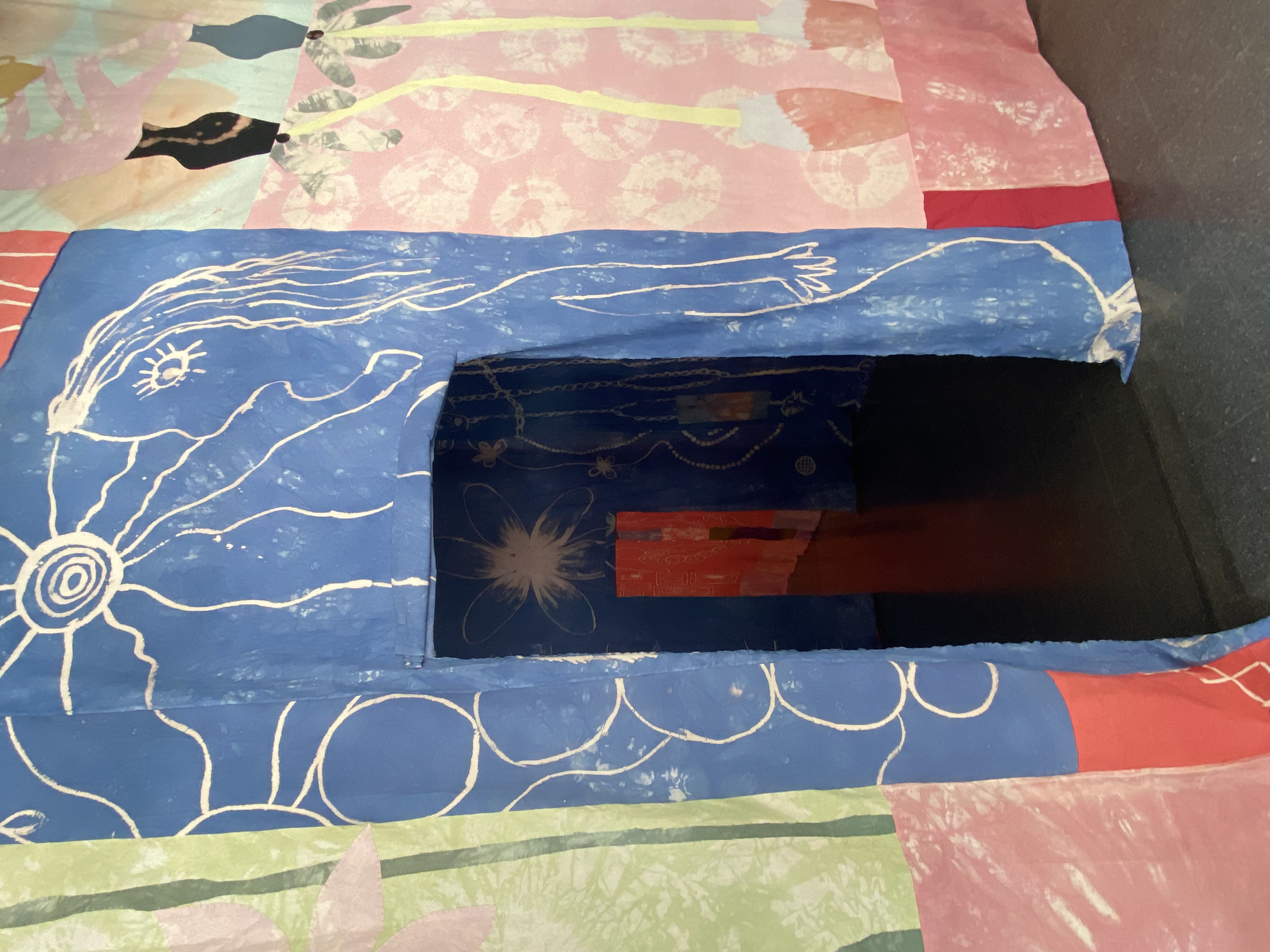 La obra se dividió en 3 espacios/cuartos. Me imaginé cada espacio como diferentes estados físicos/mentales unidos entre sí por la costura.