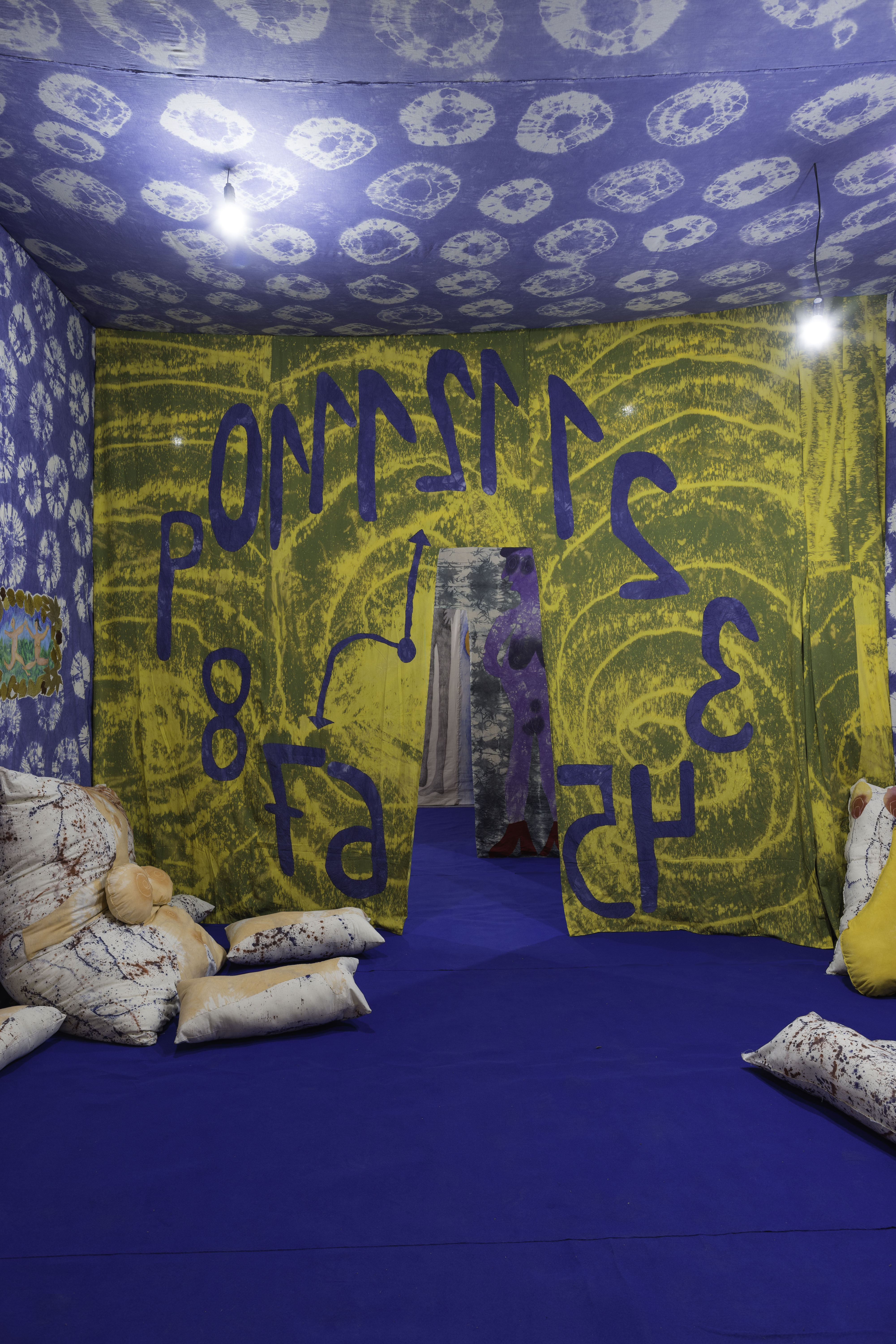 Introduced by a slightly oversized soft sculpture of a body in parts leaning in a corner, colorful monumental figures partaking in fluid life-affirming rituals grace a long blue-floored passageway, buoying visitors into a transformative voyage. These large chalk drawings lead to a smaller room where contortionists and muses both neutralize time and open onto a wide space of rebirth where visitors can rest on a few more soft body-parts sculptures as they contemplate a portrait gallery of expanded kinship. Eceiza’s installation also references temporary architectures—improvised shelter, space of childhood imagination and play, and ephemeral site of communal ritual practice—reassigning the positions of host and guest to create a space for an array of possible hospitable/hostile relationships.